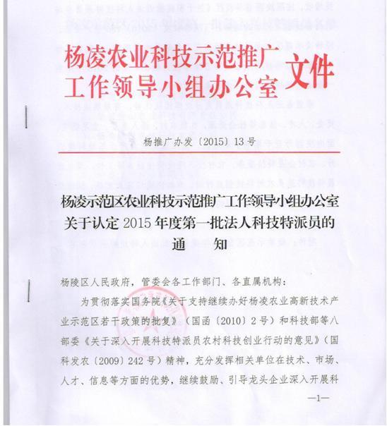 根據(jù)國務(wù)院《關(guān)于支持繼續(xù)辦好楊凌農(nóng)業(yè)高新技術(shù)產(chǎn)業(yè)示范區(qū)若干政策的批復(fù)》(國函〈2010〉2號)和科技部等八部委《關(guān)于深入開展科技特派員農(nóng)村科技創(chuàng)業(yè)行動的意見》精神,經(jīng)楊凌示范區(qū)農(nóng)業(yè)科技示范推廣工作領(lǐng)導(dǎo)小組辦公室研究,決定認(rèn)定 楊凌綠保農(nóng)林科技有限公司等五家單位為楊凌示范區(qū)2015年度第一批法人科技特派員。
